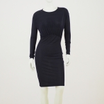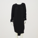 Tampraus audinio midi ilgio suknelė, trikampiu kaklu, ties juosmeniu pagal poreikį sutraukiama medžiaginiu dirželiu, šonuose skeltukai