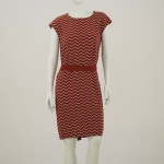 Suknelė trikampiu kaklu, trumpomis rankovėmis, liemuo šiek tiek parauktas, nuo juosmens lengvai krentanti, apatinė dalis su pamušalu, nugaroje susegama sagutėmis